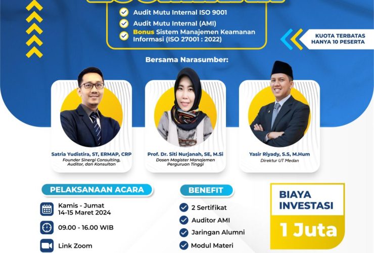 Jakarta, Maret 2024 – Sinergi Consulting dengan bangga mempersembahkan Zoominar: Private Online Class, sebuah pelatihan eksklusif tentang Audit Mutu Internal (ISO 9001) dan Audit Mutu Internal (AMI). Kelas ini dirancang khusus bagi profesional dan institusi yang ingin memperkuat kompetensi dalam ...